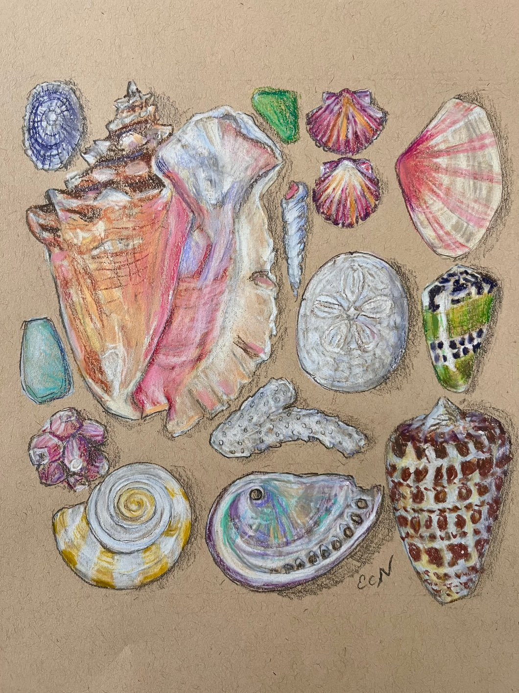 This drawing is made with oil pastel and soft crayon on unbleached toned paper.  (Image measures 8x10”)