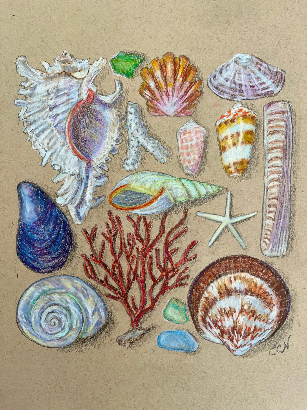 This drawing is made with oil pastel and soft crayon on unbleached toned paper.  (Image measures appx. 8x10”)