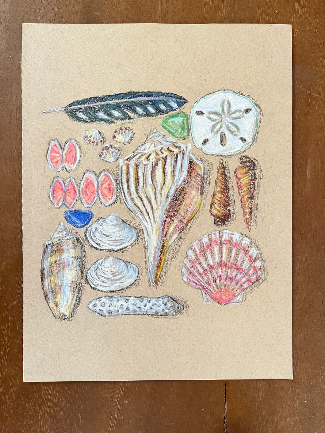 This drawing is made with oil pastel and soft crayon on unbleached toned paper.  (Image measures 8x10”)