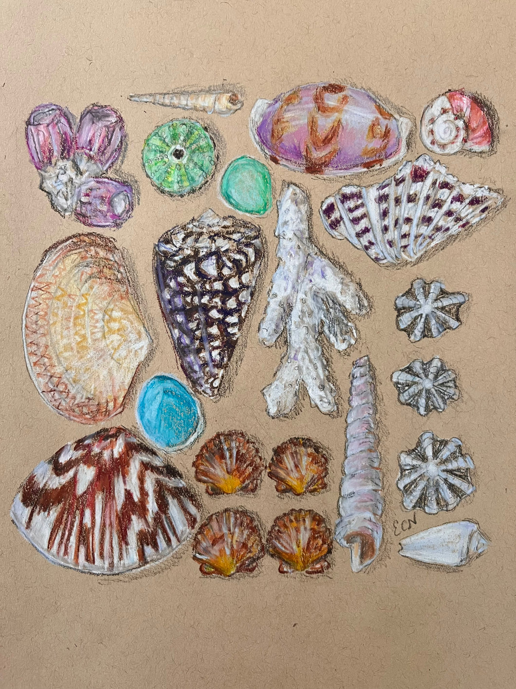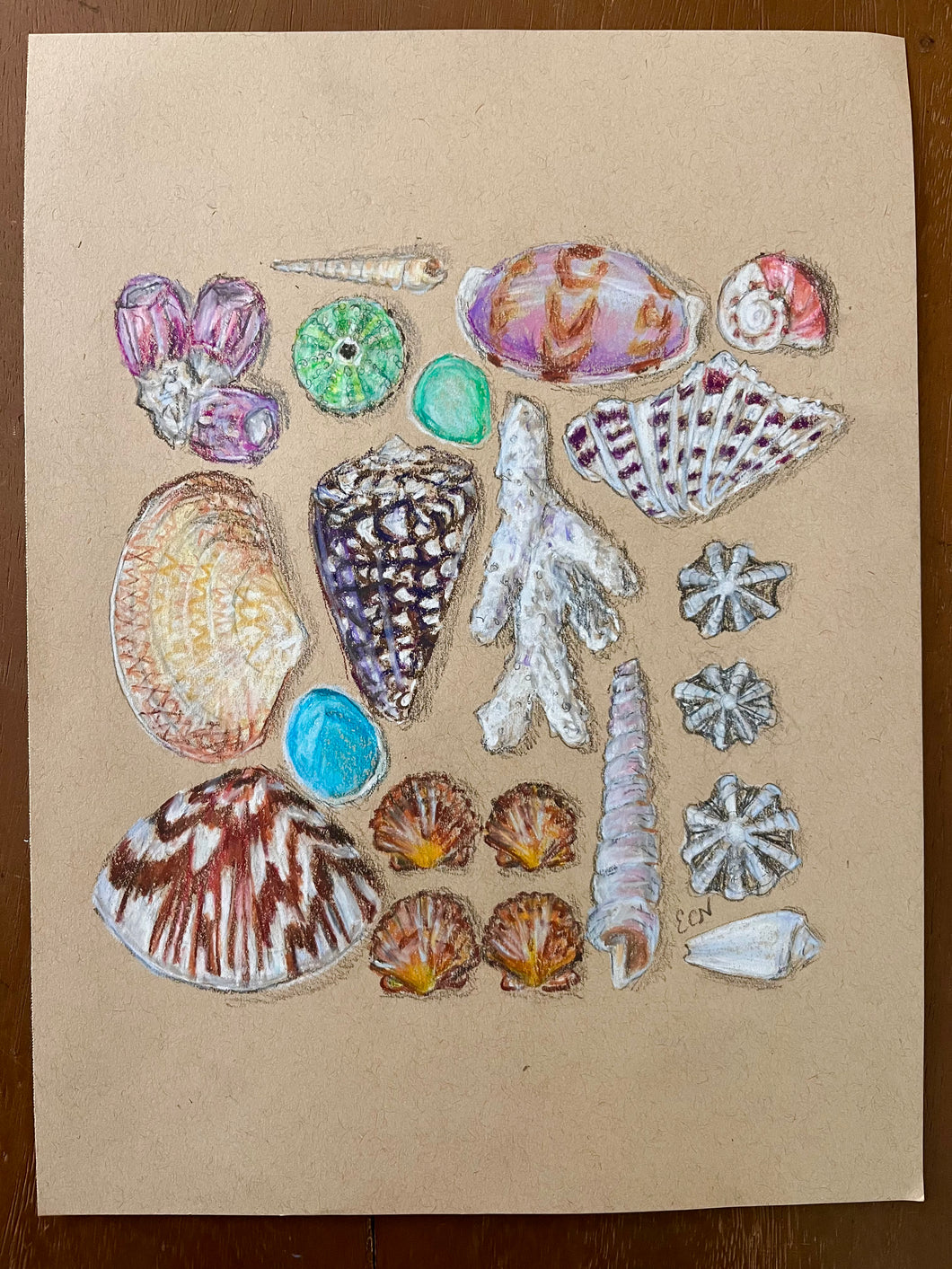 This drawing is made with oil pastel and soft crayon on unbleached toned paper.  (Image measures 8x10”)