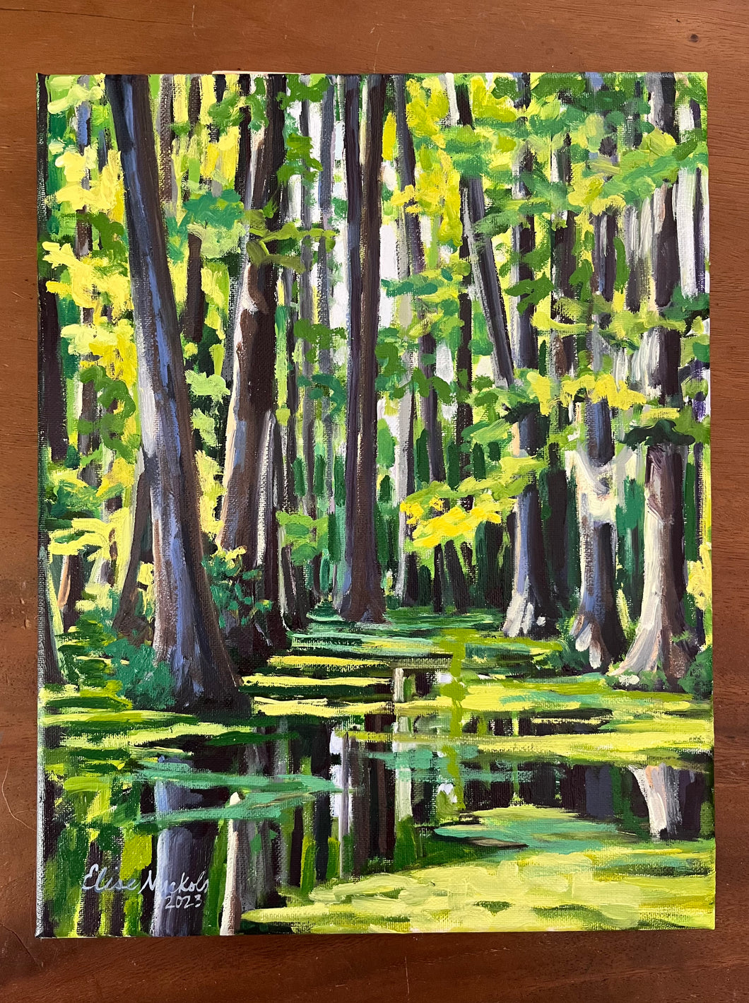 This is an original piece created with oil paint on stretched canvas. The painting wraps the edge of the canvas, and it is signed by Elise.
