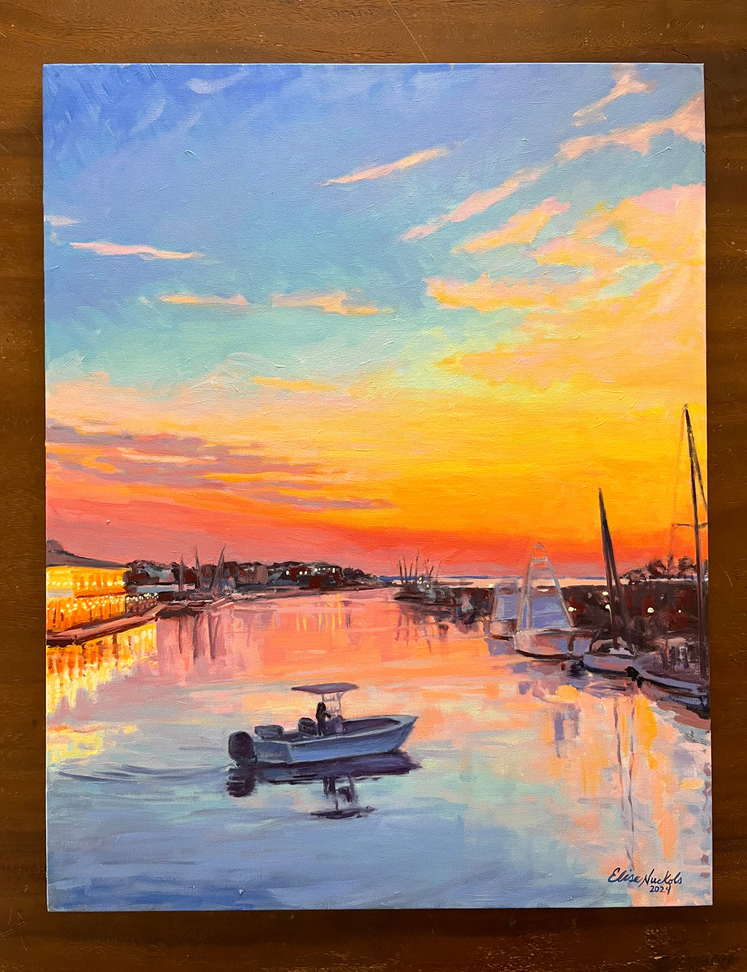 This is an original piece created with oil paint on stretched canvas.  The painting wraps the edge of the canvas, and it is signed by Elise.  Care has been taken to accurately photograph the painting, though colors may vary slightly in person.  All pieces are shipped via UPS from Charleston, South Carolina