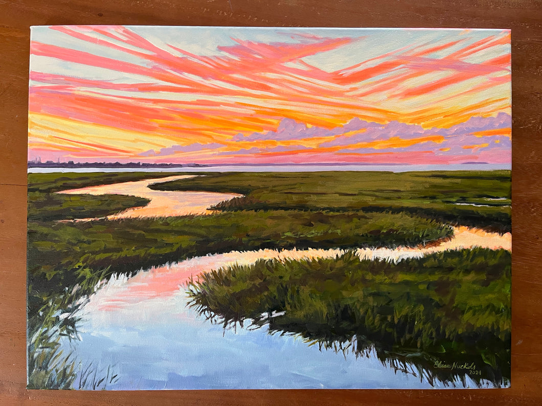This is an original piece created with oil paint on stretched canvas.  The painting wraps the edge of the canvas, and it is signed by Elise.  Colors may vary slightly in person and all pieces are shipped via UPS from Charleston, South Carolina