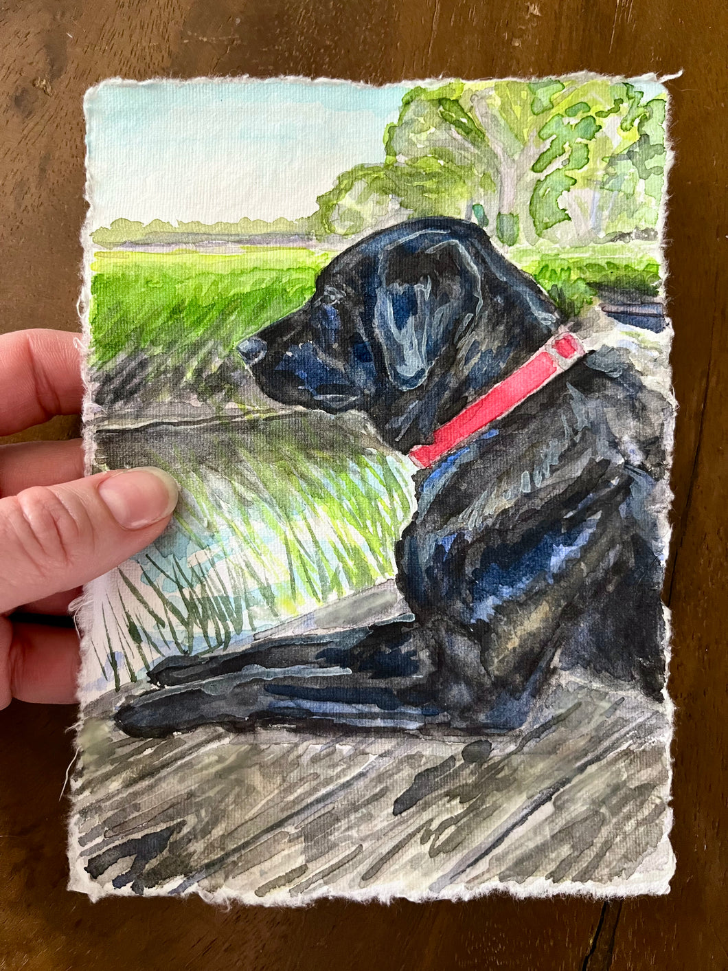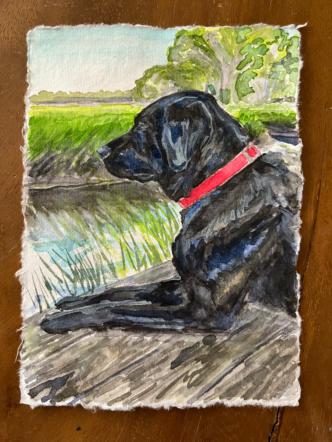 This painting is made with watercolor on heavy, hand pressed, deckled-edged watercolor paper.