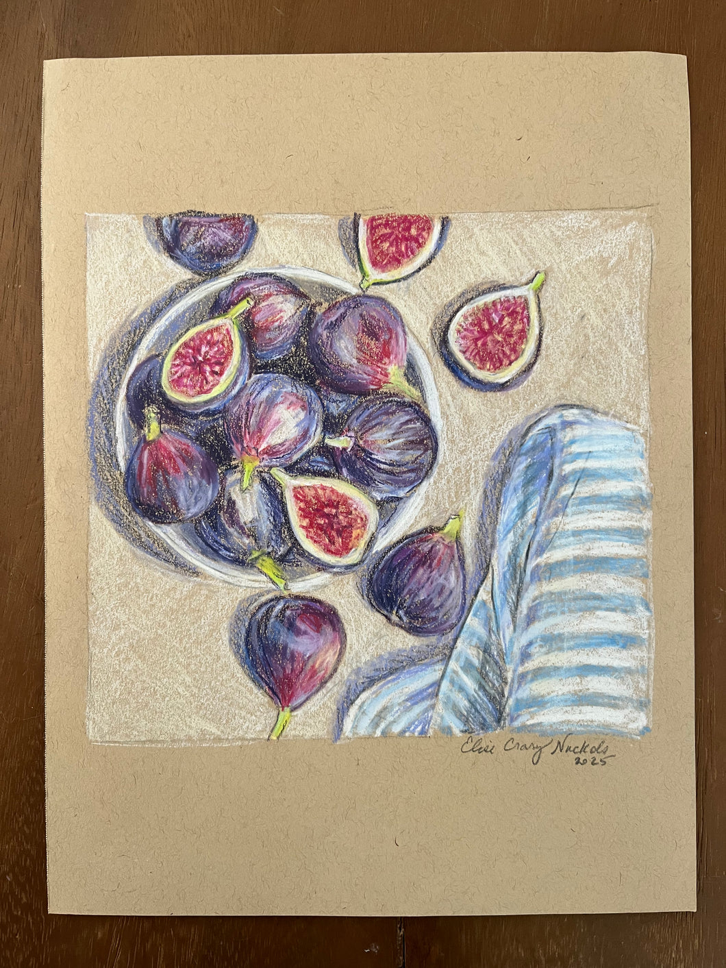 This drawing is made with oil pastel and soft crayon on unbleached toned paper.  (Image measures appx. 8.5x 8”)