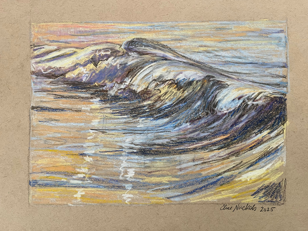 This drawing is made with oil pastel and soft crayon on unbleached toned paper.  (Image measures appx. 8.5x10.5”)