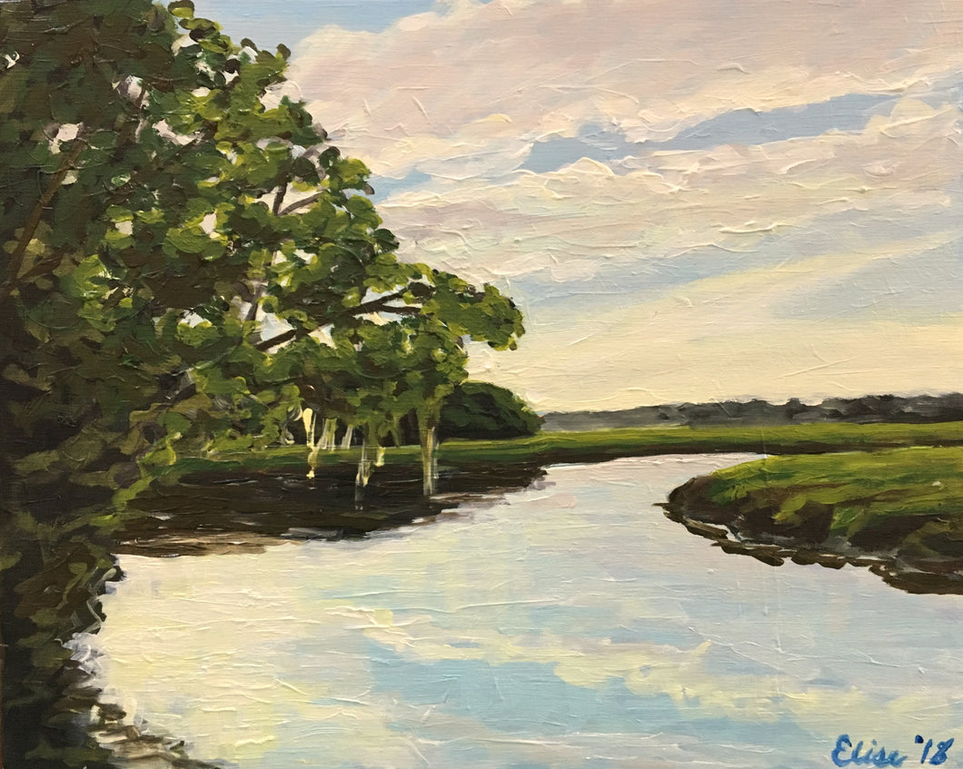 This is an original oil painting on a birch panel. The sides are painted white and it is signed by Elise. Colors may vary slightly in person and all pieces are shipped via UPS from Charleston, South Carolina