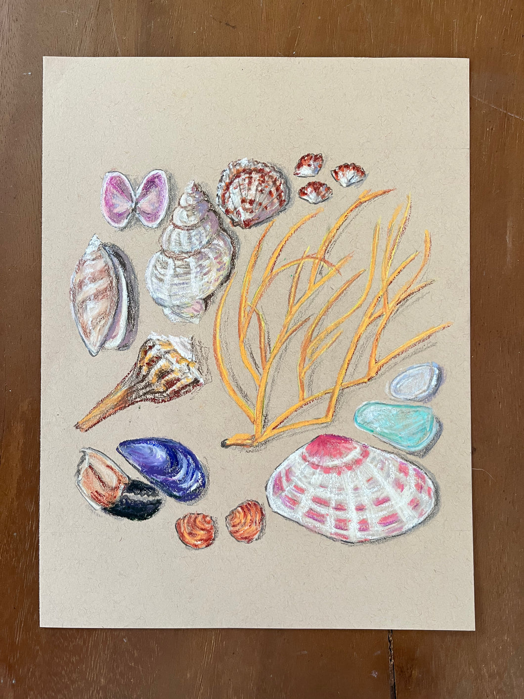 This drawing is made with oil pastel and soft crayon on unbleached toned paper.  (Image measures 8x10”)